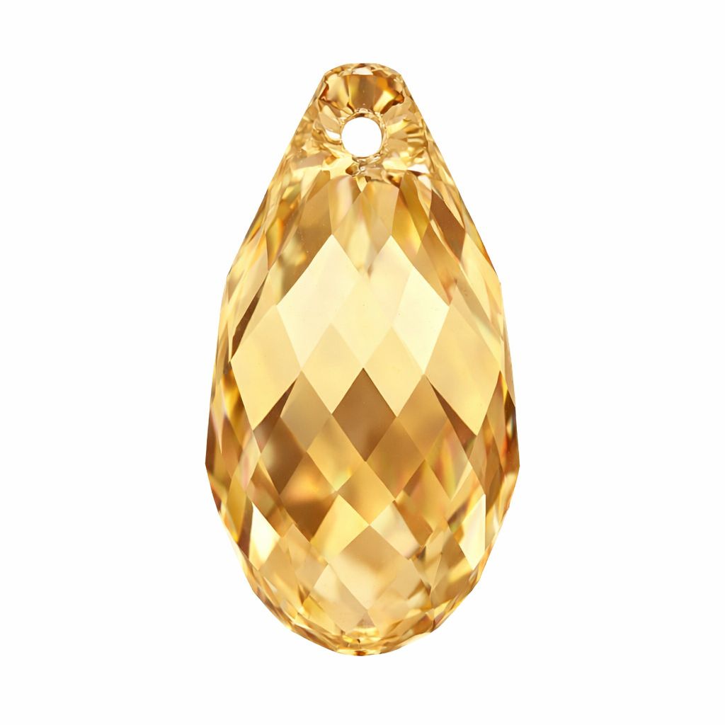 Goccia in cristallo con forma classica sfaccettata. La pietra misura 17,0 x 8,5 mm ed è nel colore Crystal Golden Shadow, con una tonalità dorata su base trasparente. Il modello non presenta foro confermato. Utilizzata come elemento decorativo in gioielli e pendenti.