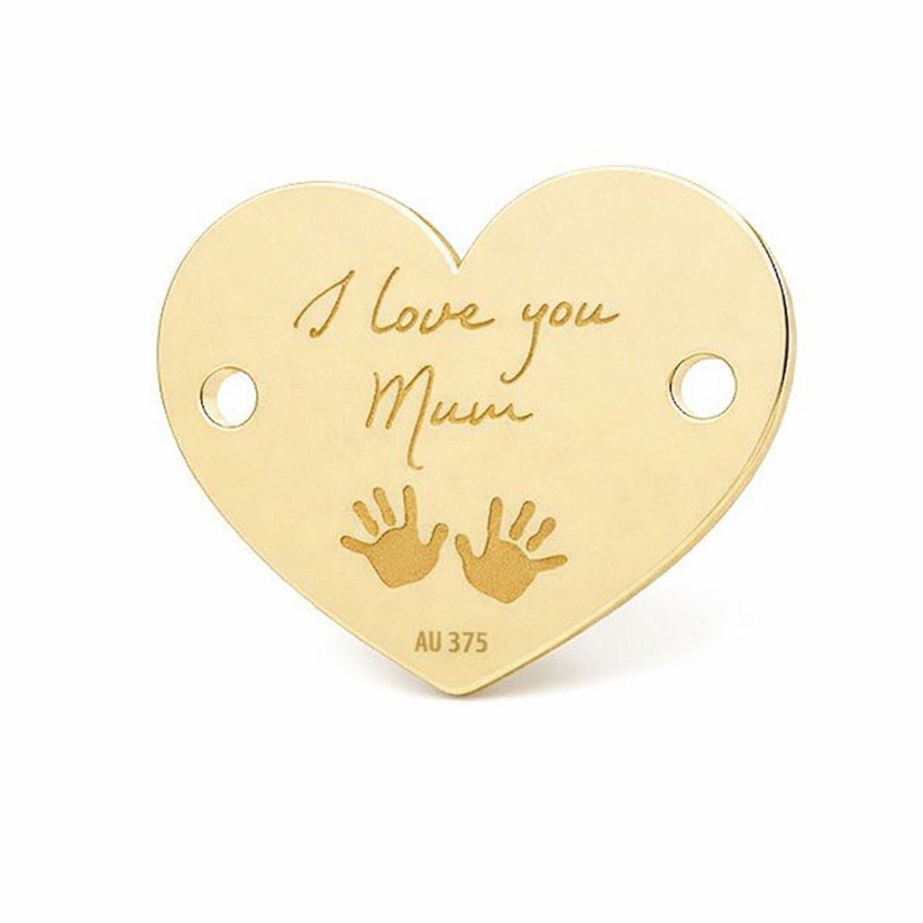 Il connettore a forma di cuore con il motivo della mano di un bambino in oro AU 375 è un semifabbricato preciso dal forte valore simbolico. Il tema familiare si adatta a collezioni commemorative ed emozionali.