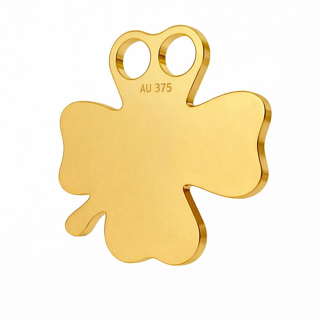 Il connettore con motivo a quadrifoglio in oro AU 375 è un semifabbricato delicato dal significato positivo. Il simbolo della fortuna si adatta a gioielli personalizzati e moderni.